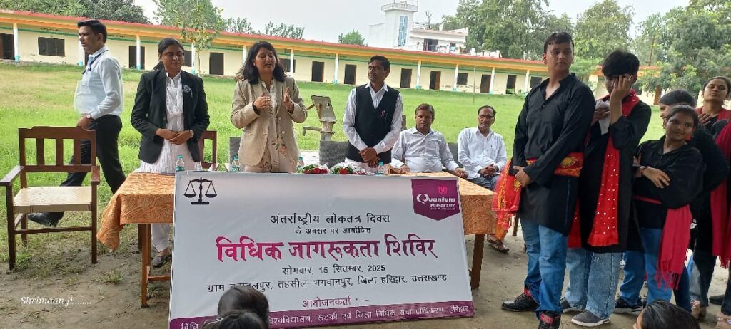 हरिद्वार:(चीफ एडिटर) भगवानपुर में अंतर्राष्ट्रीय हिन्दी दिवस एवं विश्व लोकतन्त्र दिवस के उपलक्ष्य में आज किसान इंटर कॉलेज, बहबलपुर, विकासखंड भगवानपुर, जिला हरिद्वार में विधिक जागरूकता एवं साक्षरता शिविर का आयोजन किया गया। यह कार्यक्रम उत्तराखण्ड राज्य विधिक सेवा प्राधिकरण, नैनीताल के निर्देश एवं जिला विधिक सेवा प्राधिकरण, हरिद्वार के आदेशानुसार क्यान्टम विश्वविद्यालय, भगवानपुर के विधि विभाग के सहयोग से सम्पन्न हुआ।