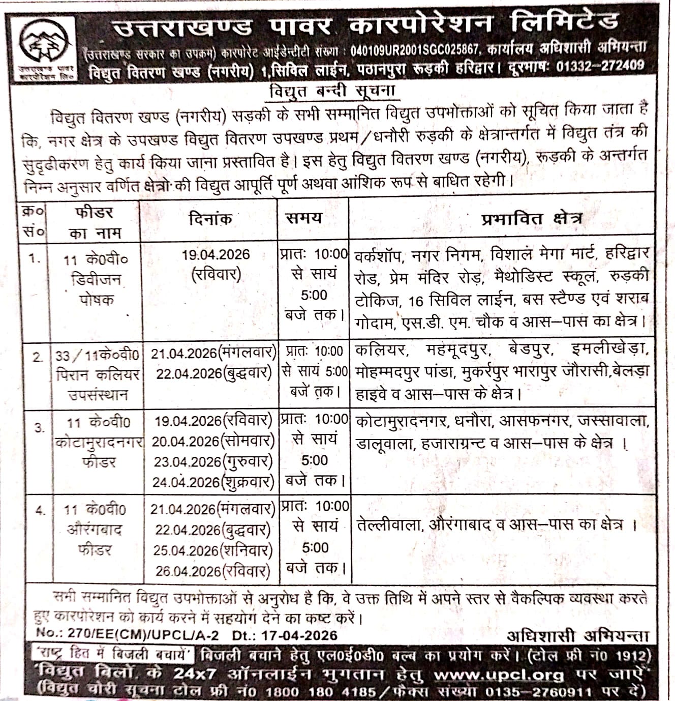 पिरान कलियर:(जीशान मलिक)पिरान कलियर उपसंस्थान से जुड़े दर्जनों गांवों में बुधवार को भी बिजली आपूर्ति बाधित रहेगी। UPCL द्वारा अनुरक्षण कार्यों के चलते 22 अप्रैल बुधवार को भी सुबह 10 बजे से शाम 5 बजे तक बिजली बंद रहेगी।बिजली विभाग के अनुसार कलियर, महमूदपुर, बेडपुर, इमलीखेड़ा, मोहम्मदपुर पांडा, मुकर्रपुर, भारापुर, जौरासी और बेलड़ा हाइवे से सटे इलाकों में आपूर्ति पूरी तरह ठप रहेगी।