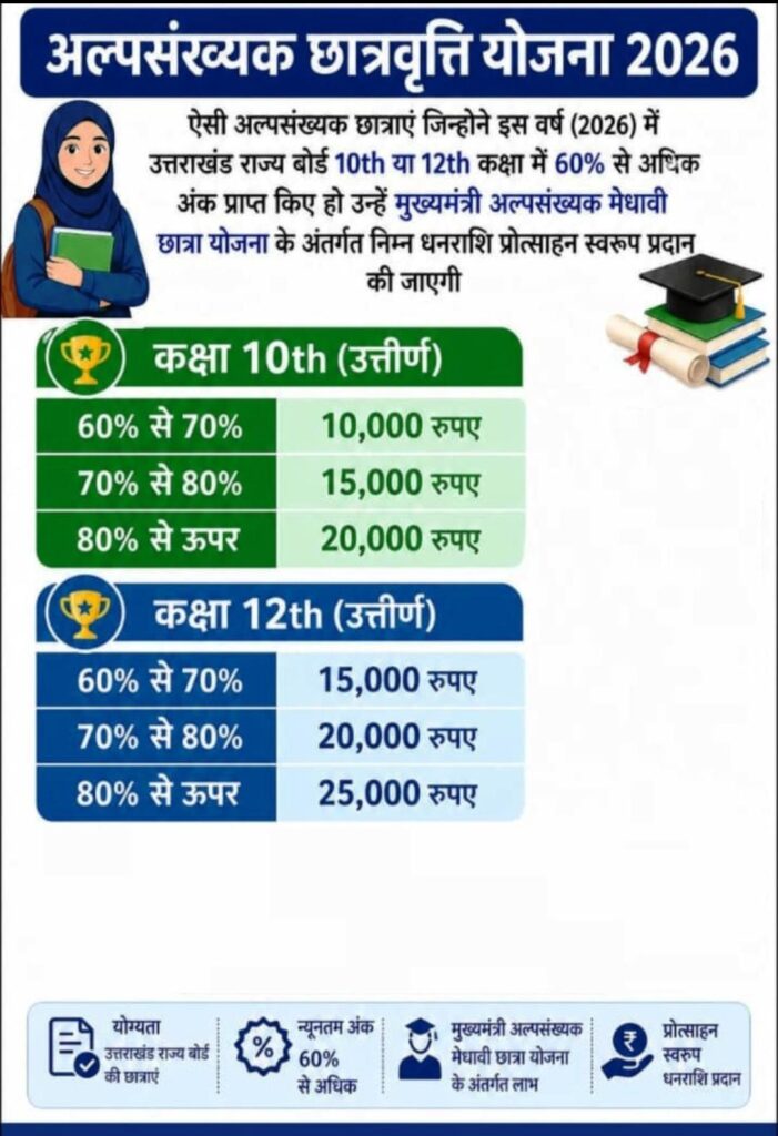 देहरादून:(जीशान मलिक)उत्तराखंड सरकार ने मुख्यमंत्री अल्पसंख्यक मेधावी छात्रा योजना 2026 के तहत अल्पसंख्यक छात्राओं के लिए बड़ी घोषणा की है। वर्ष 2026 में उत्तराखंड राज्य बोर्ड से 10वीं या 12वीं कक्षा में 60% से अधिक अंक प्राप्त करने वाली छात्राओं को प्रोत्साहन स्वरूप धनराशि दी जाएगी।