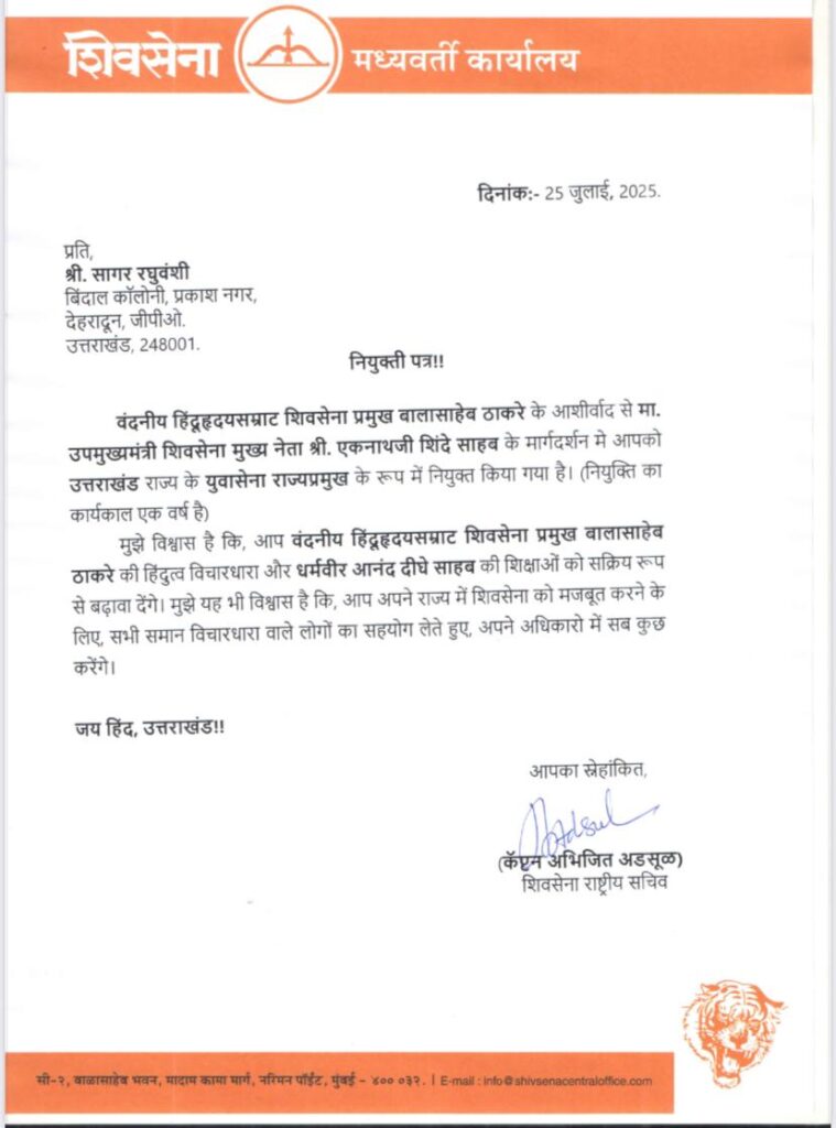 “उत्तराखंड में शिवसेना को नई ऊर्जा: सागर रघुवंशी बने युवासेना प्रदेश प्रमुख”