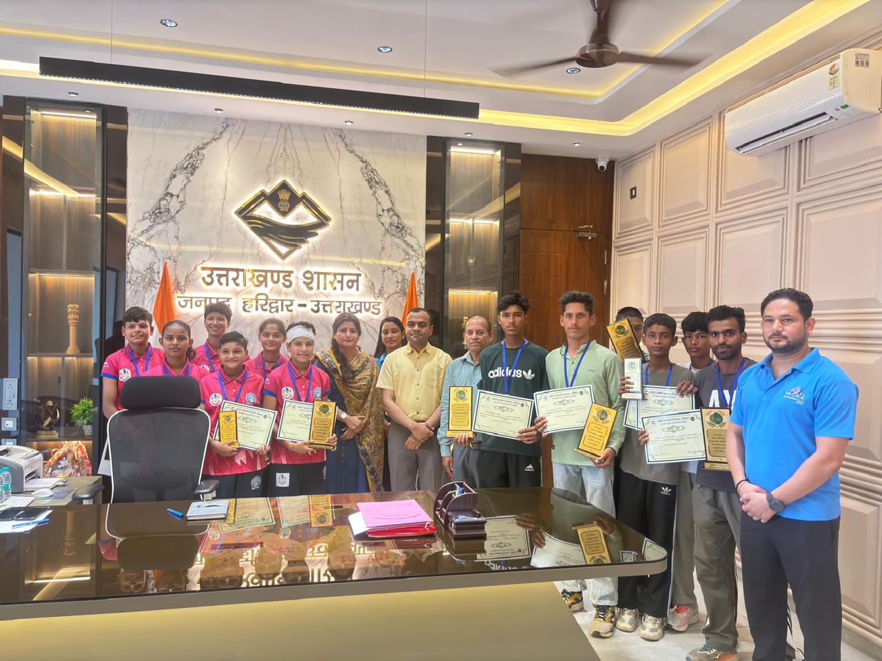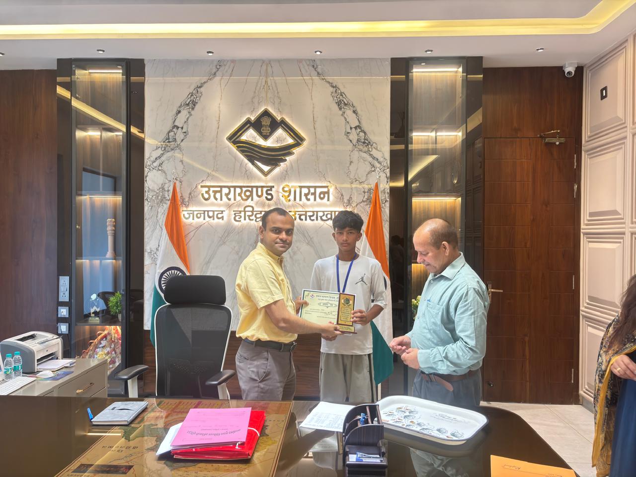 हरिद्वार:(ज़ीशान मलिक)जिला प्रशासन एवं समाज कल्याण विभाग के तत्वाधान में नशा मुक्त भारत अभियान के सफल क्रियान्विन हेतु 12 जून को रन अगेंस्ट ड्रग्स दौड का आयोजन विकास भवन रोशनाबाद हरिद्वार से स्पोर्टस स्टेडियम रोशनाबाद हरिद्वार तक किया गया। इस दौड़ में अंडर 14 बालक एवं बालिका वर्ग तथा ओपन आयु वर्ग के अन्तर्गत समस्त आयु वर्ग के प्रतिभागियों द्वारा प्रतिभाग किया गया। उक्त दौड़ में हर वर्ग से प्रथम तीन पायदान प्राप्त करने वाले प्रतिभागियों को आज जिला कार्यालय में जिलाधिकारी मयूर दीक्षित द्वारा प्रथम, द्वितीय एवं तृतीय स्थान प्राप्त करने वाले छात्र छात्राओं को मेडल, ट्राफी एवं प्रमाण पत्र प्रदान देकर सम्मानित किया गया।