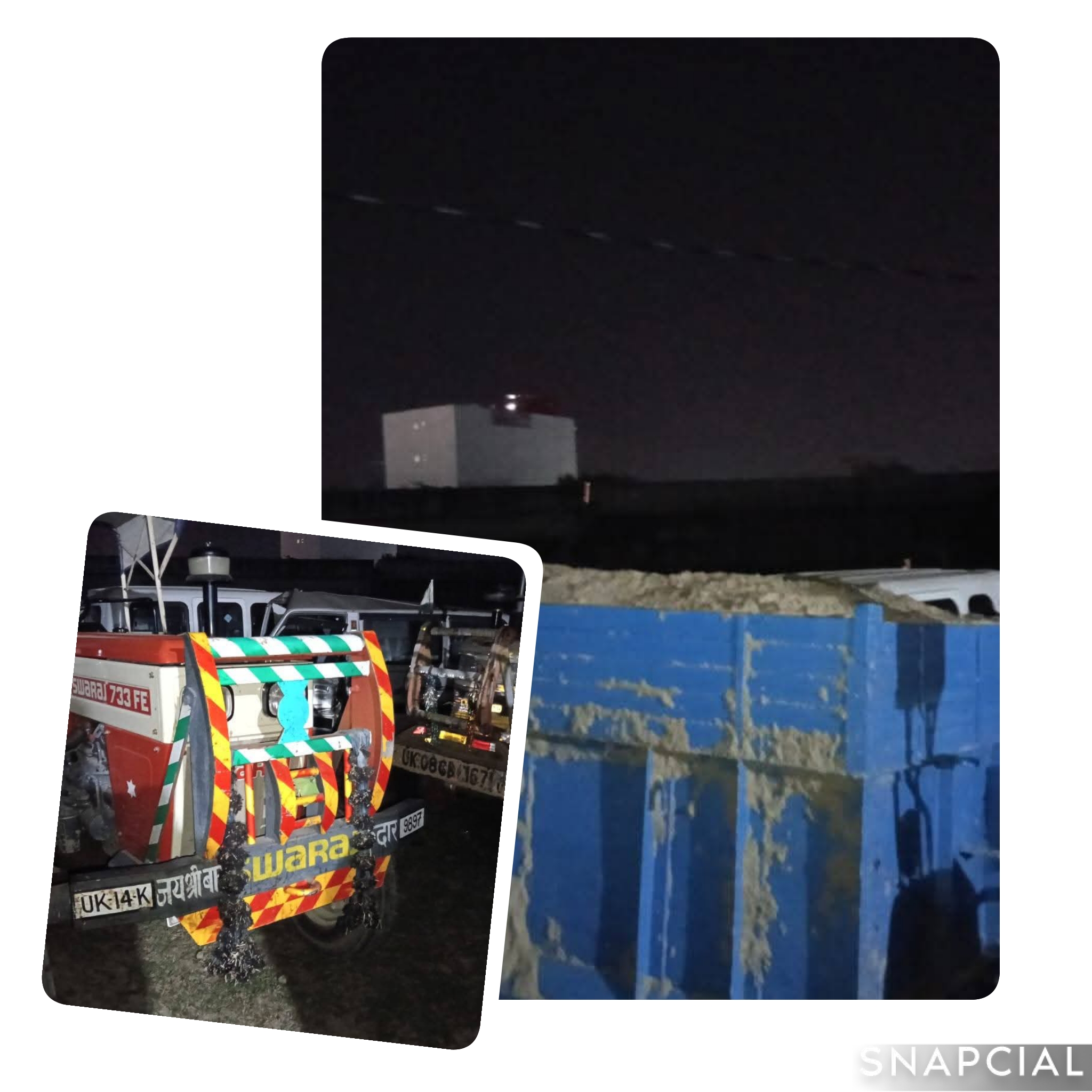 तो टैक्ट्रर चालक विनय कुमार पुत्र हेमराज निवासी ग्राम श्यामपुर हरिद्वार के पास खनन सामाग्री सम्बन्धी कोई वैध कागजात न मिलने पर उक्त टैक्ट्रर ट्राली को मोटर वाहन अधिनियम के अन्तर्गत सीज कर वाहन मे परिवहनित अवैध खनन सामाग्री के सम्बन्ध मे सम्बन्धित प्राधिकारी को रिपोर्ट प्रेषित प्रेषित की गयी है।