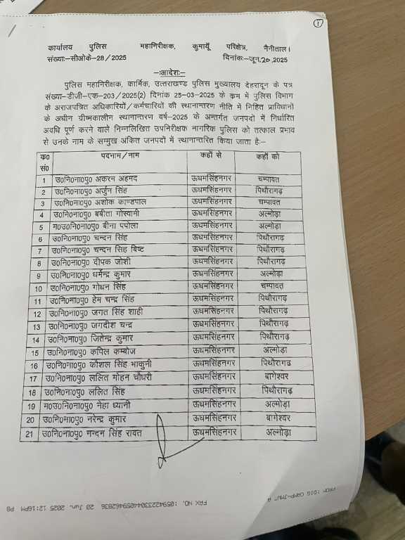 देहरादून:(रागिब नसीम) उत्तराखंड पुलिस विभाग में ग्रीष्मकालीन स्थानांतरण सत्र 2025 के अंतर्गत कुमाऊं मंडल में बड़ा प्रशासनिक फेरबदल किया गया है। कुमाऊं परिक्षेत्र की पुलिस महानिरीक्षक रिद्धिम अग्रवाल द्वारा जारी आदेश के अनुसार, क्षेत्र के 101 उपनिरीक्षकों (सब-इंस्पेक्टर) और 221 आरक्षियों (कांस्टेबलों) के तबादले किए गए हैं।