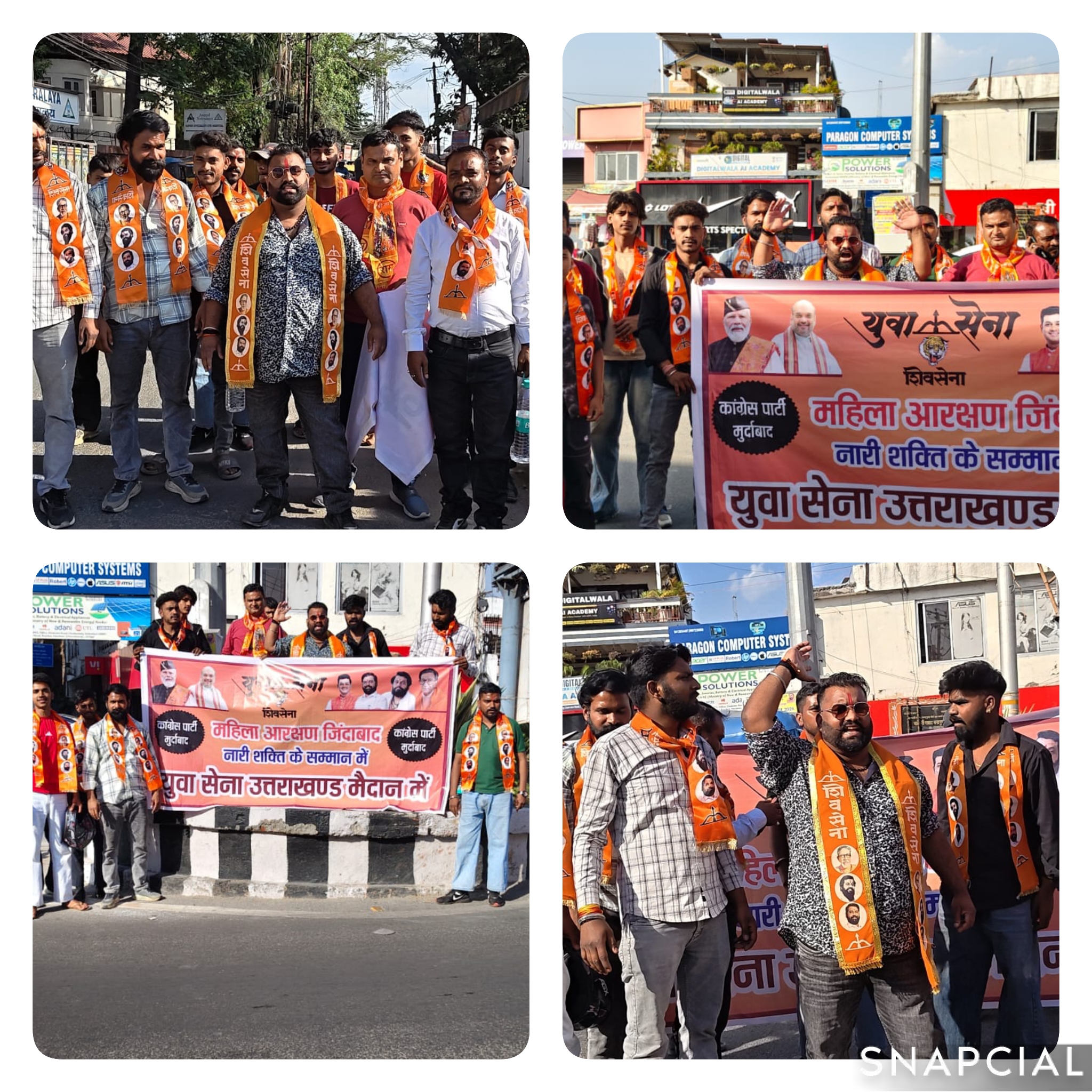 देहरादून:(भगवा सनातन टाइम्स संवाददाता)महिला आरक्षण विधेयक के संसद में पारित न हो पाने के विरोध में आज युवा सेना ने देहरादून के तिलक रोड पर शांतिपूर्ण प्रदर्शन किया। कार्यकर्ताओं ने संसद और विधानसभाओं में महिलाओं को 33% आरक्षण सुनिश्चित करने की मांग उठाई।