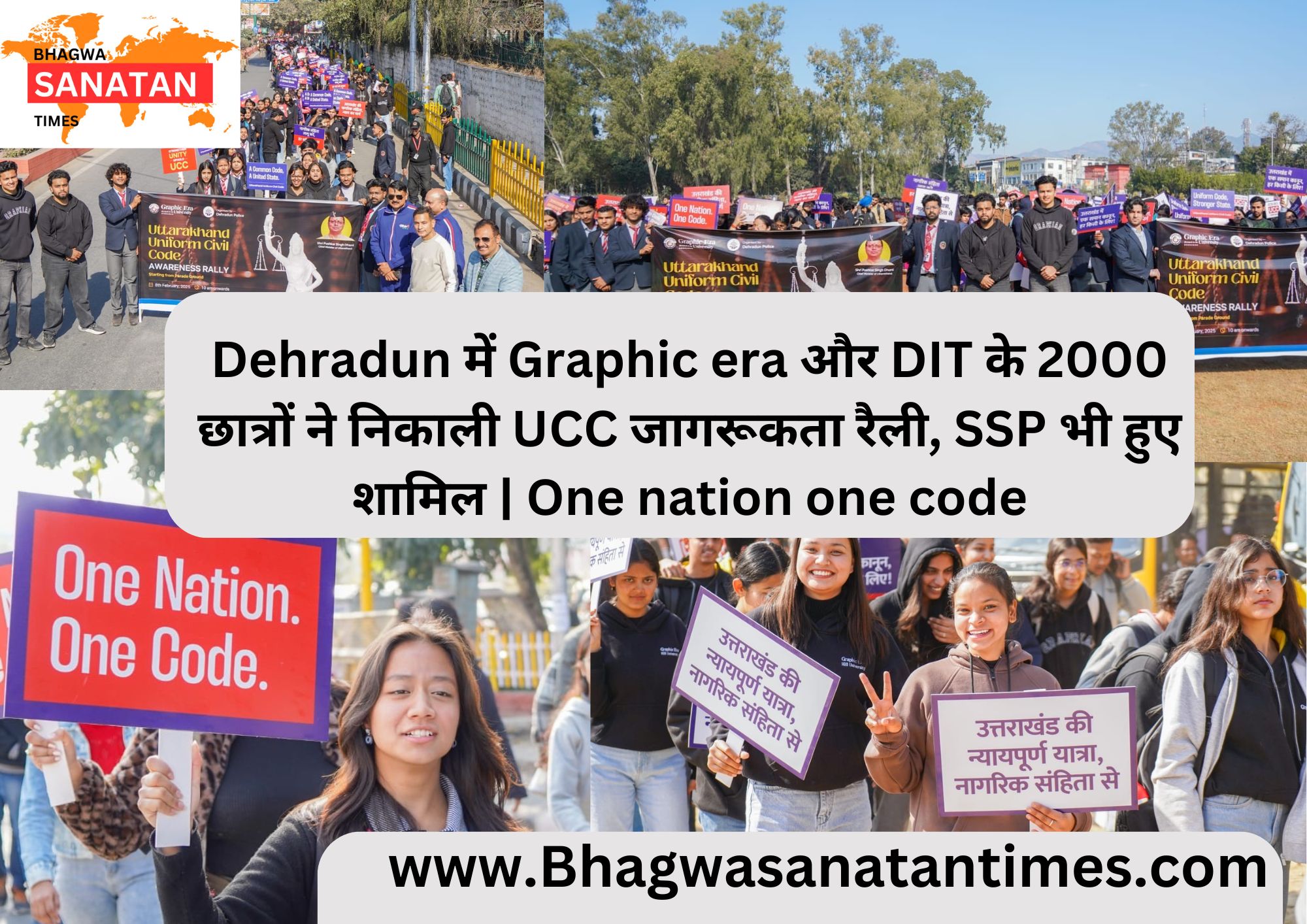 Dehradun में यूनिफॉर्म सिविल कोड (UCC) को लेकर जागरूकता फैलाने हेतु दून पुलिस के सहयोग से एक भव्य रैली आयोजित की गई। इस रैली में ग्राफिक एरा और डी०आई०टी० विश्वविद्यालय के करीब 2000 छात्र-छात्राओं ने भाग लिया। उन्होंने पोस्टर, बैनर्स और स्लोगन के माध्यम से “वन नेशन, वन कोड” का समर्थन किया और आम जनता को यू०सी०सी० के महत्व के बारे में जागरूक किया।