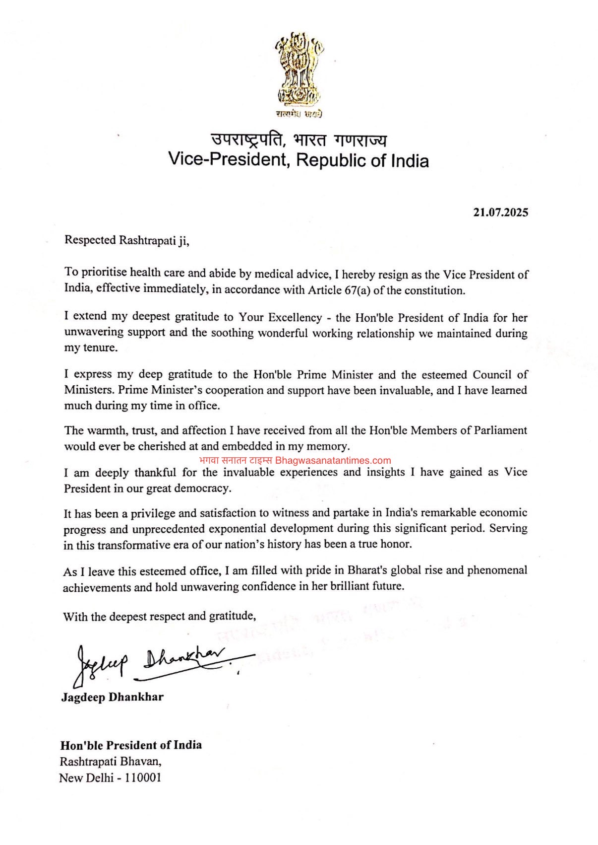 “स्वास्थ्य सेवा को प्राथमिकता देने और चिकित्सकीय परामर्श का पालन करते हुए मैं भारत के उपराष्ट्रपति पद से तत्काल प्रभाव से त्यागपत्र दे रहा हूं। यह निर्णय संविधान के अनुच्छेद 67(क) के अनुसार लिया गया है।”